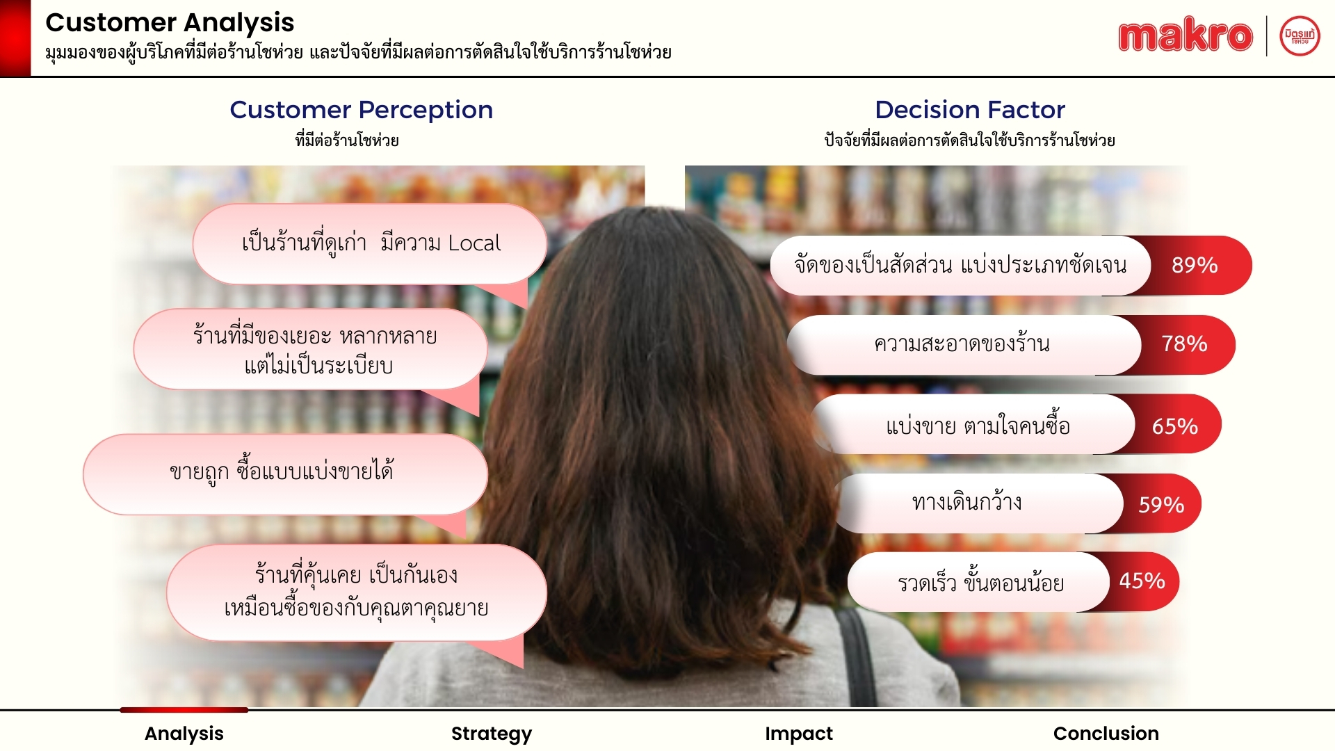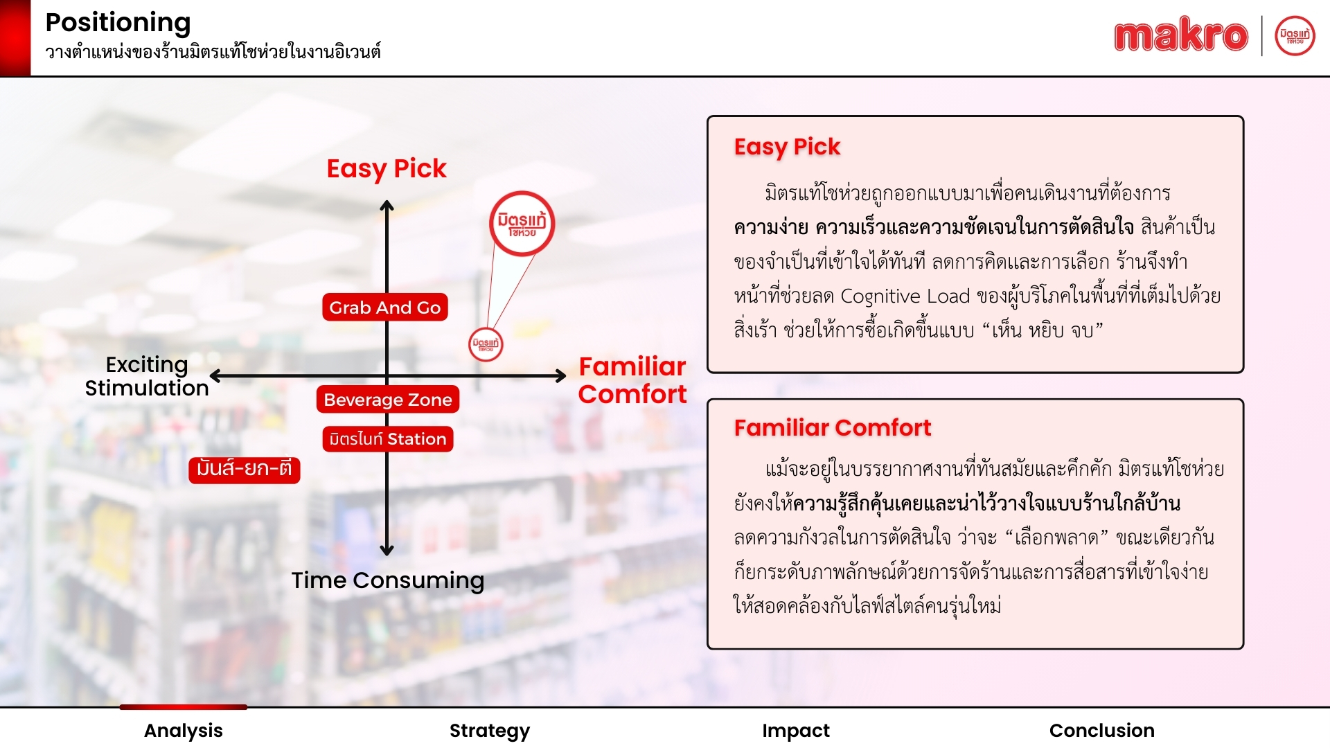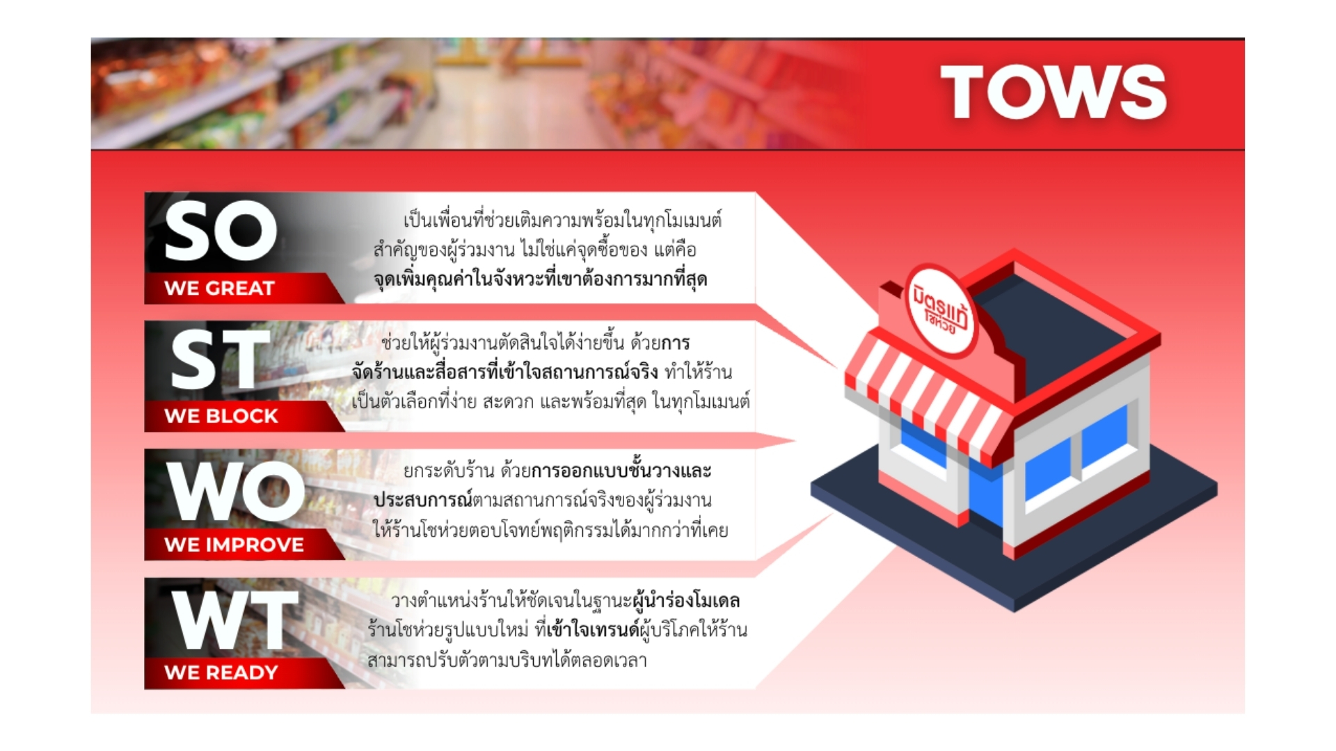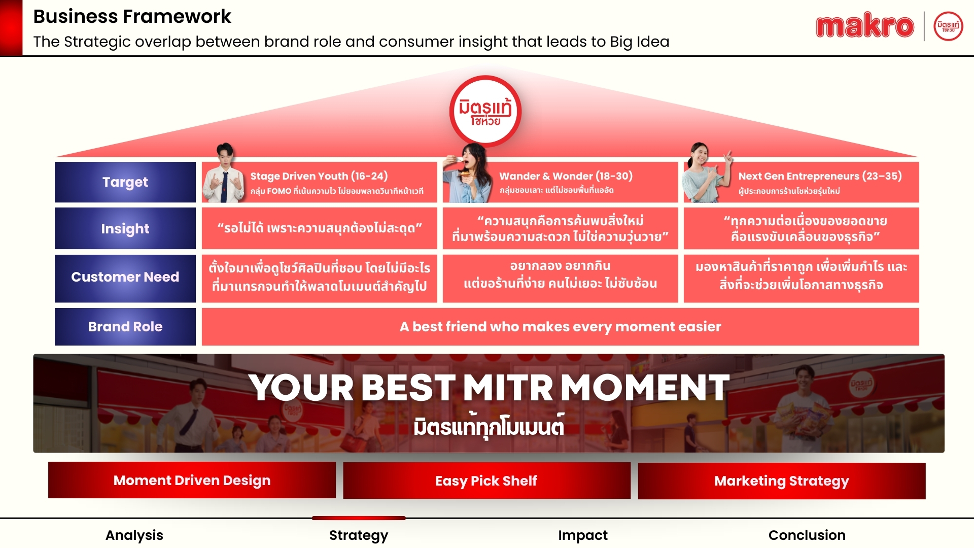 จากการเก็บข้อมูลและการสัมภาษณ์เชิงลึก พบว่าผู้บริโภคยุคใหม่ที่มาเดินงานหรือเข้าร้านโชห่วย มักเผชิญกับความไม่สะดวกจากขั้นตอนที่ใช้เวลาและการรอคอยที่ไม่จำเป็น การต้องแวะหลายจุดหรือใช้เวลาตัดสินใจนาน ทำให้พลาดโมเมนต์สำคัญของงานและความสนุกที่ตั้งใจมาสัมผัส ส่งผลให้ประสบการณ์โดยรวมสะดุด และร้านค้าถูกมองเป็นเพียงจุดซื้อของ ไม่ใช่ส่วนหนึ่งของประสบการณ์งาน ปัจจัยเหล่านี้นำไปสู่โอกาสสำคัญที่ร้านมิตรแท้โชห่วย จะใช้กลยุทธ์เข้าไปเป็นเพื่อนที่คอยเสริมความสะดวกสบาย ช่วยให้ทุกโมเมนต์ในงานของพวกเขาเต็มไปด้วยความทรงจำที่ดีในงาน ผ่านการส่งมอบความเข้าใจและประสบการณ์ที่ดี ด้วยกลยุทธ์หลัก ดังนี้