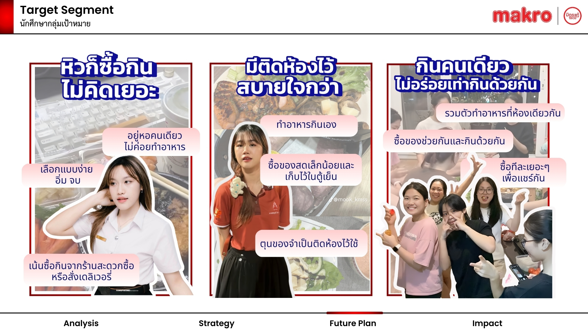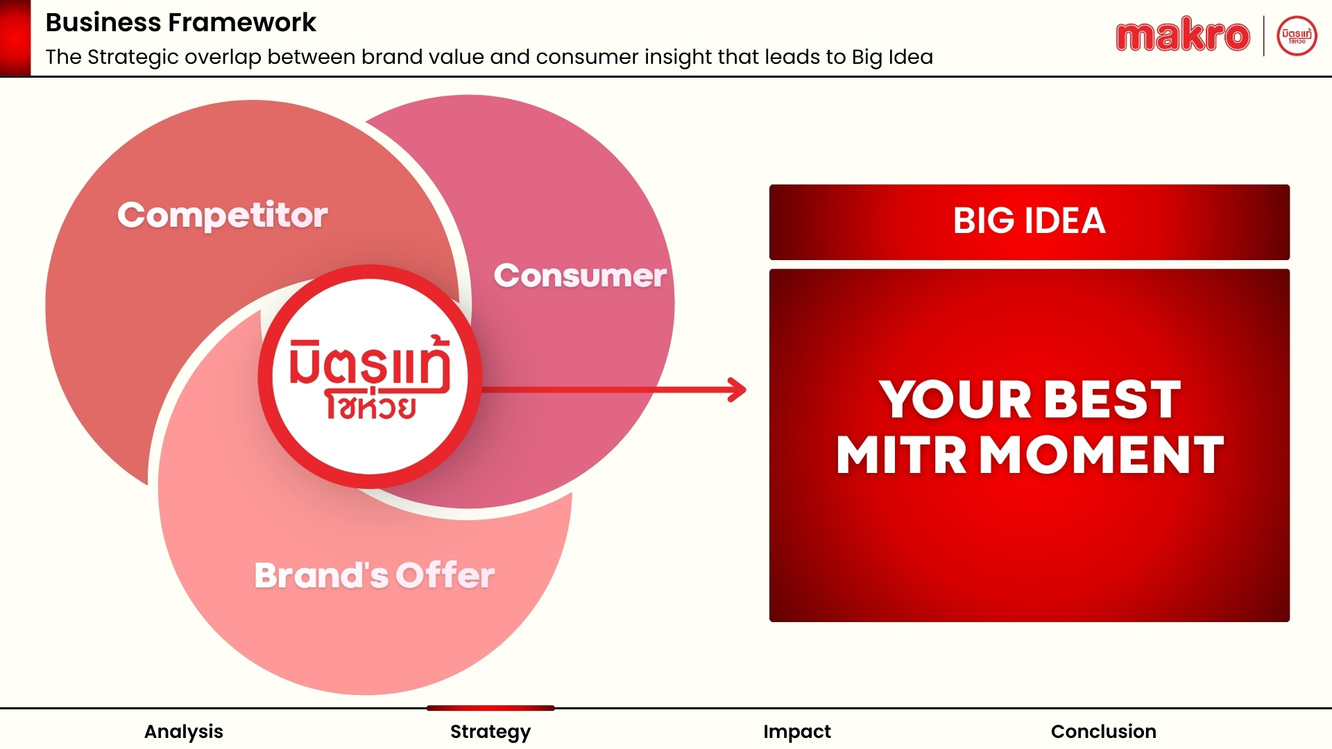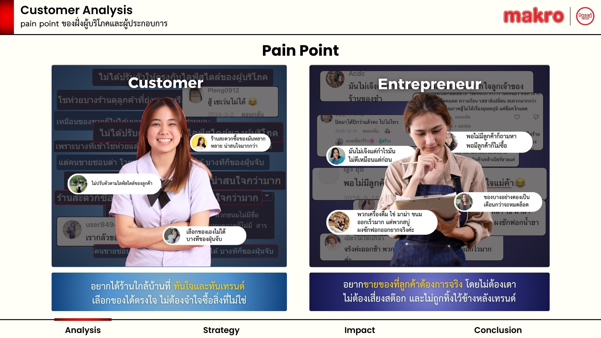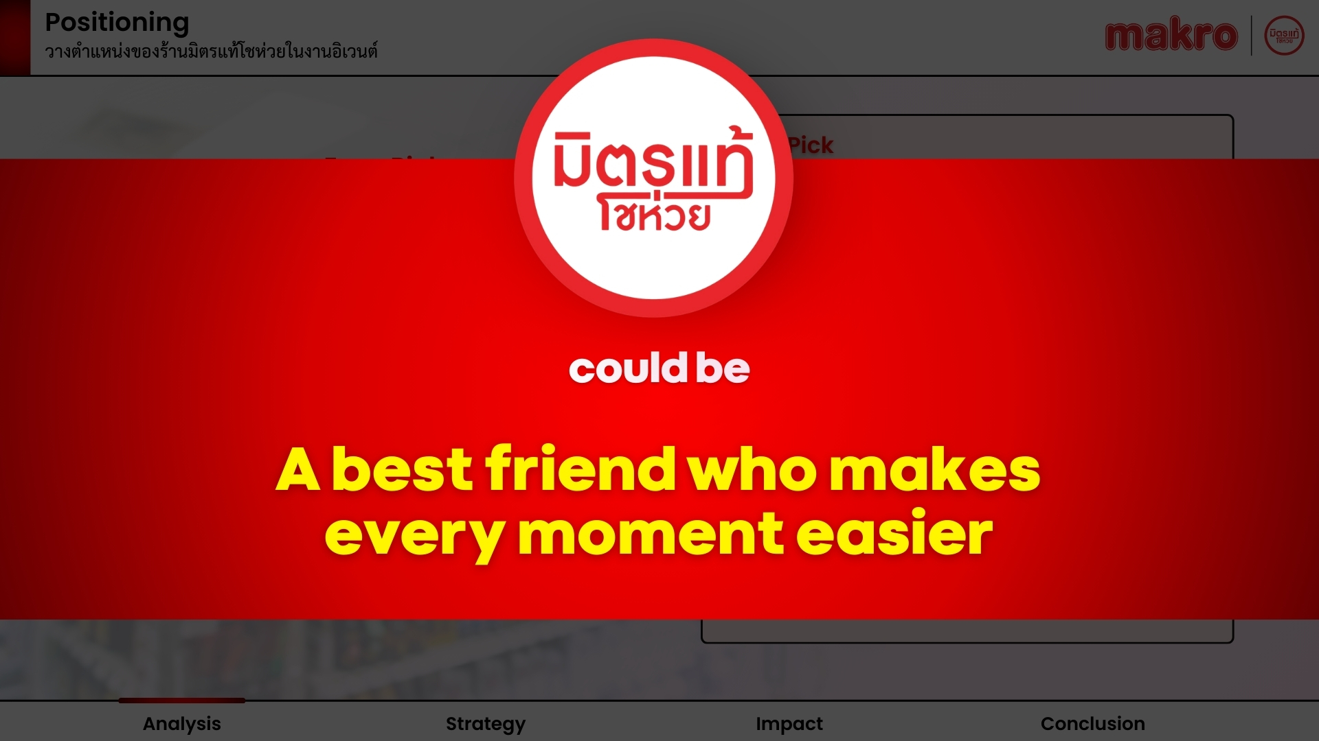 จากการเก็บข้อมูลและการสัมภาษณ์เชิงลึก พบว่าผู้บริโภคยุคใหม่ที่มาเดินงานหรือเข้าร้านโชห่วย มักเผชิญกับความไม่สะดวกจากขั้นตอนที่ใช้เวลาและการรอคอยที่ไม่จำเป็น การต้องแวะหลายจุดหรือใช้เวลาตัดสินใจนาน ทำให้พลาดโมเมนต์สำคัญของงานและความสนุกที่ตั้งใจมาสัมผัส ส่งผลให้ประสบการณ์โดยรวมสะดุด และร้านค้าถูกมองเป็นเพียงจุดซื้อของ ไม่ใช่ส่วนหนึ่งของประสบการณ์งาน ปัจจัยเหล่านี้นำไปสู่โอกาสสำคัญที่ร้านมิตรแท้โชห่วย จะใช้กลยุทธ์เข้าไปเป็นเพื่อนที่คอยเสริมความสะดวกสบาย ช่วยให้ทุกโมเมนต์ในงานของพวกเขาเต็มไปด้วยความทรงจำที่ดีในงาน ผ่านการส่งมอบความเข้าใจและประสบการณ์ที่ดี ด้วยกลยุทธ์หลัก ดังนี้