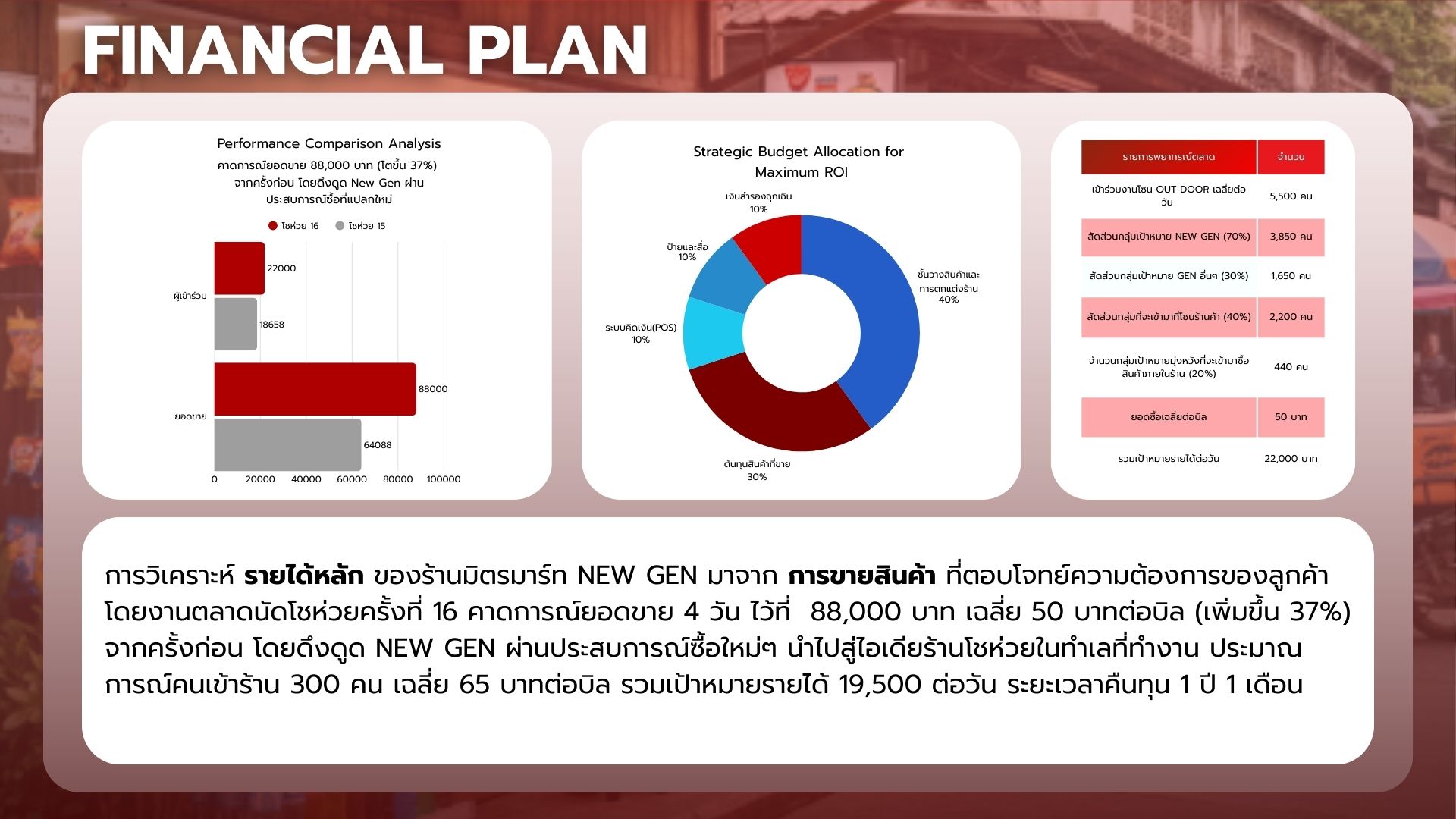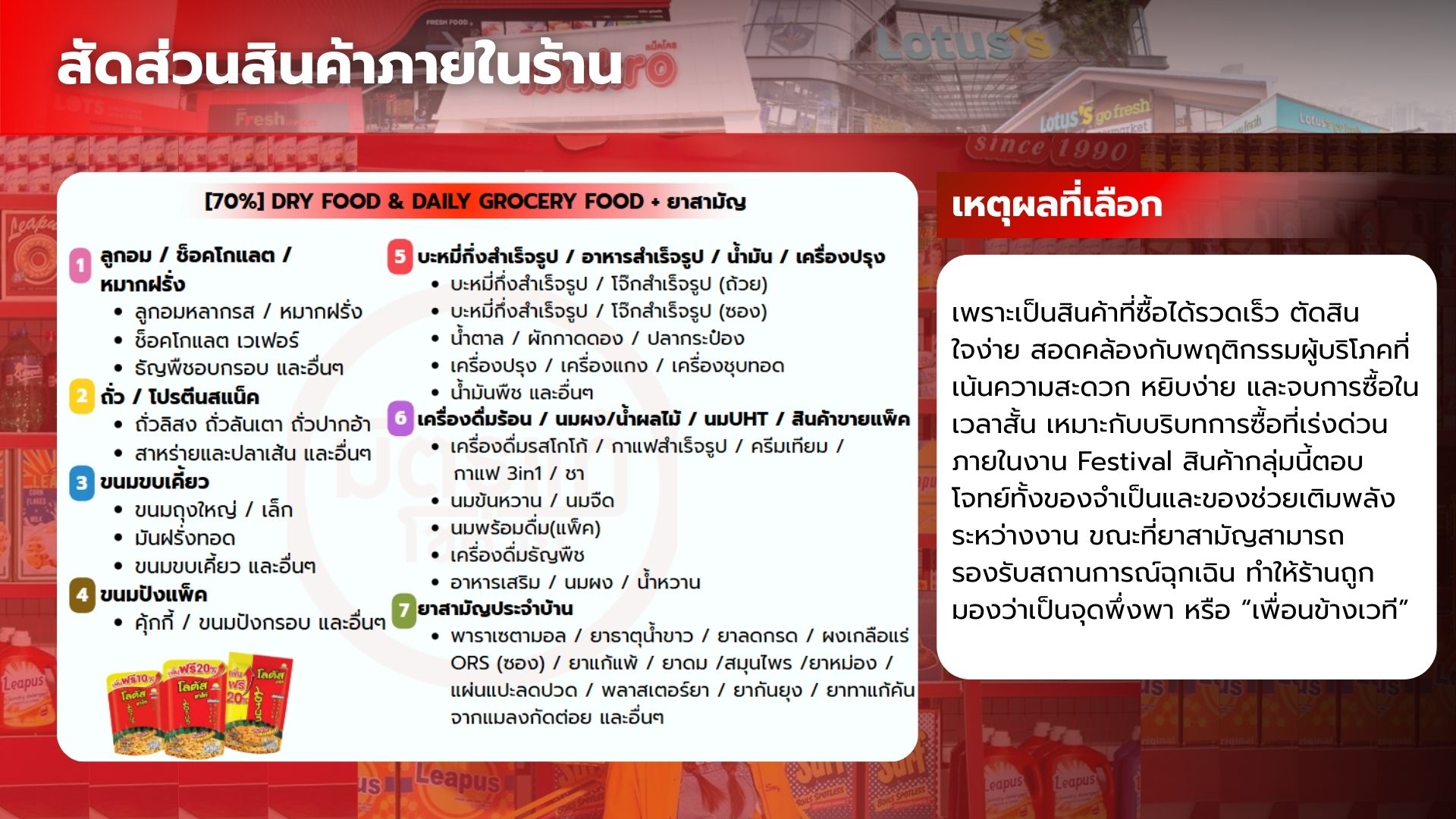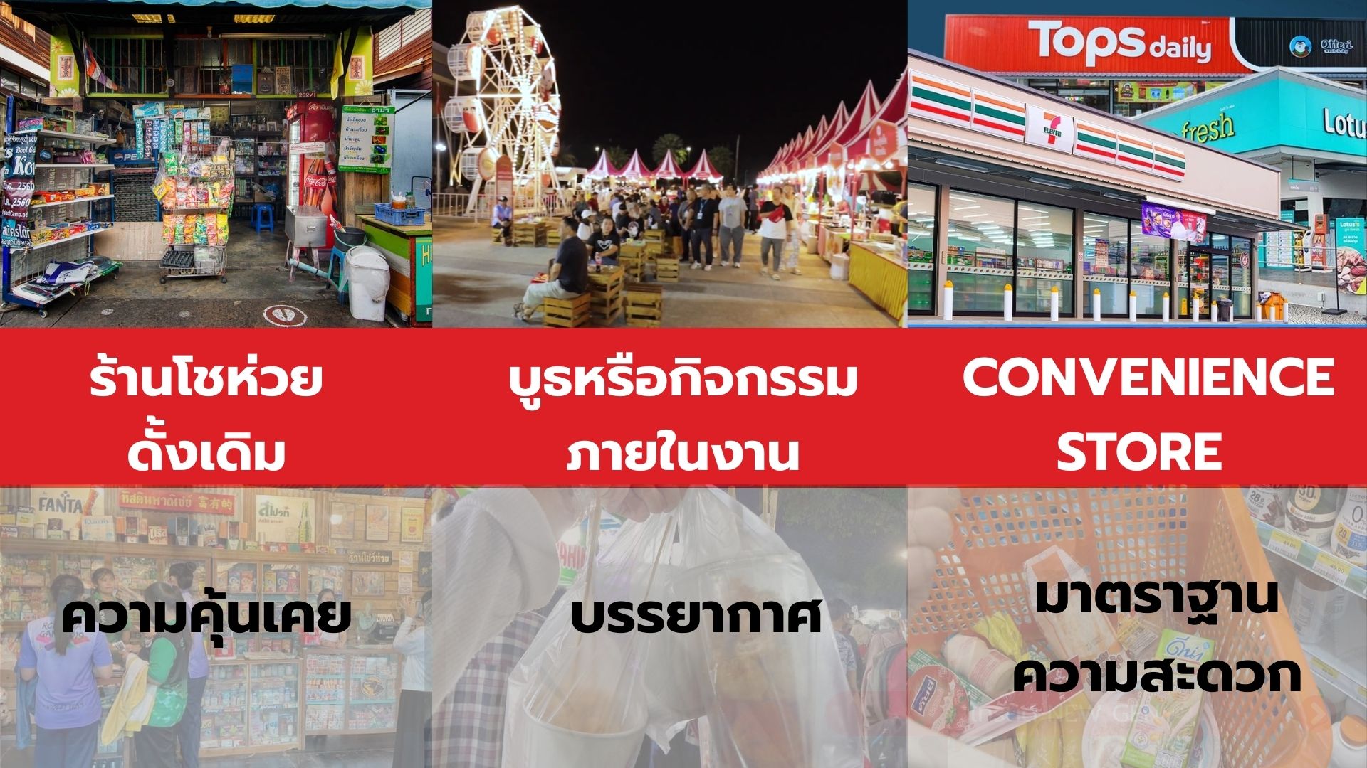 เมื่อพิจารณาในบริบทของการจัดร้านภายในงาน (ตลาดนัดโชห่วยครั้งที่ 16) ซึ่งเป็นพื้นที่ที่ผู้บริโภคมีระยะเวลาในการตัดสินใจซื้อจำกัด และมีตัวเลือกที่หลากหลาย ร้านโชห่วยในรูปแบบดั้งเดิมจึงยังไม่สามารถตอบโจทย์ได้อย่างเหมาะสม ทั้งในด้านภาพลักษณ์ ความสะดุดตา และประสบการณ์การซื้อ ส่งผลให้เกิดความจำเป็นในการพัฒนารูปแบบร้านโชห่วยให้ทันสมัย และสอดคล้องกับพฤติกรรมของผู้บริโภครุ่นใหม่มากยิ่งขึ้น หากร้านยังคงนำเสนอในรูปแบบเดิม ย่อมทำให้ผู้บริโภคมองร้านโชห่วยเป็นเพียง “ร้านซื้อของจำเป็น” ไม่ใช่พื้นที่ที่น่าเข้า น่าค้นหา หรือสะท้อนไลฟ์สไตล์ของคนรุ่นใหม่ ทำให้สูญเสียโอกาสในการสร้างการจดจำและความเชื่อมโยงทางอารมณ์กับผู้บริโภคในบริบทของงาน