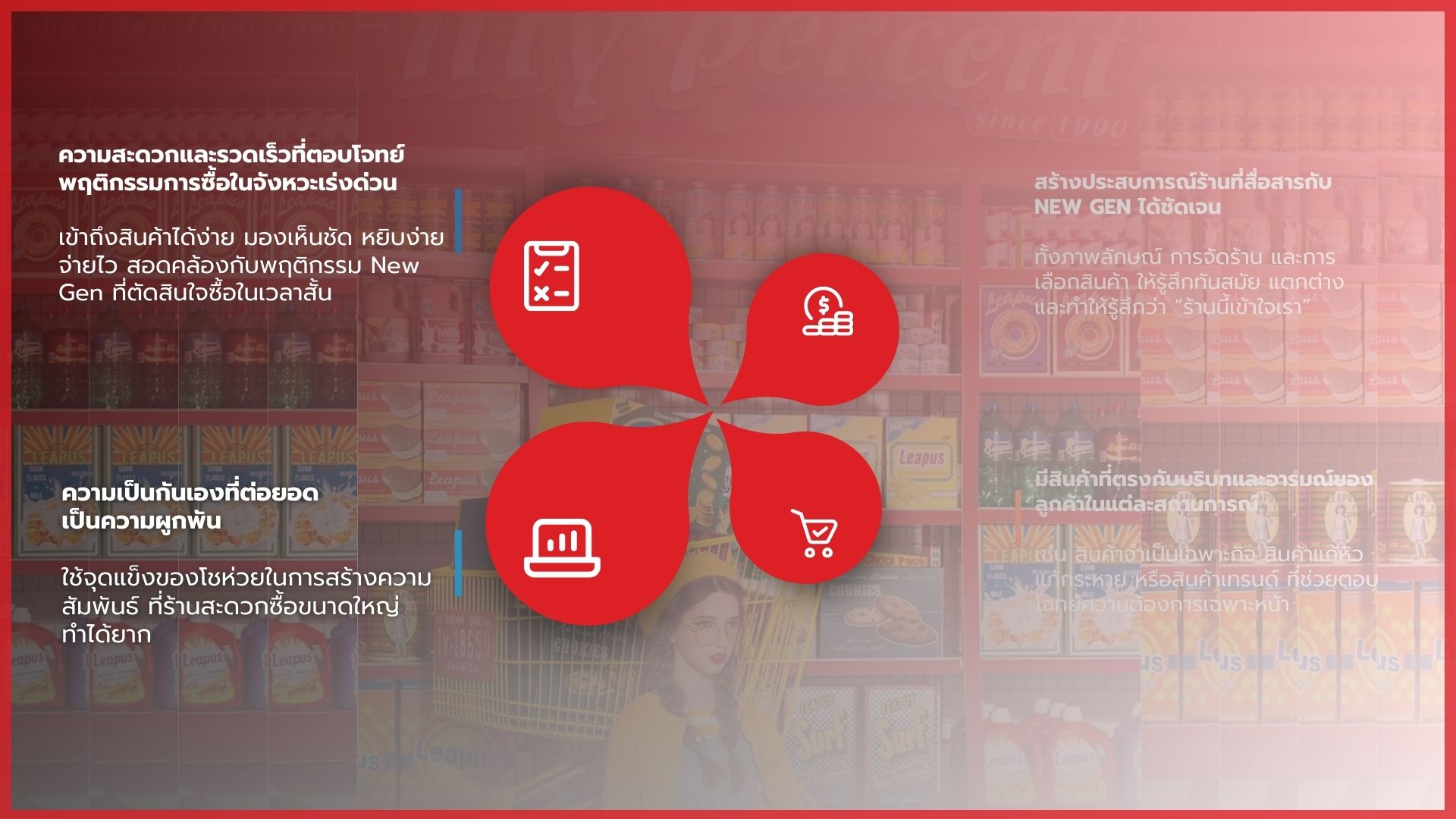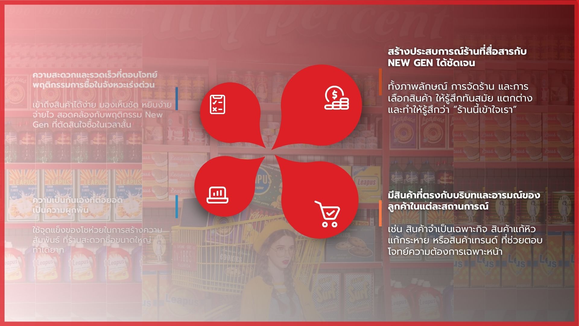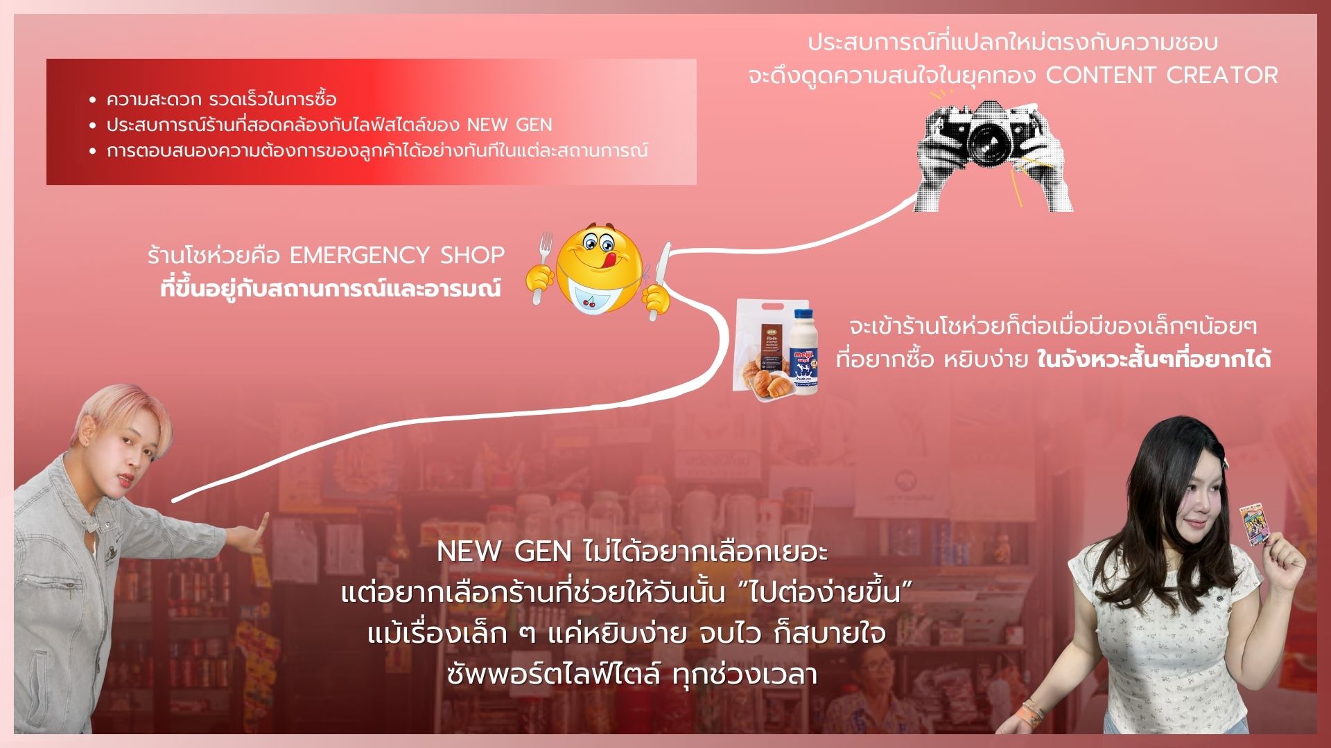 ในปัจจุบัน ร้านโชห่วยส่วนใหญ่ยังคงดำเนินธุรกิจในรูปแบบดั้งเดิม ทั้งด้านภาพลักษณ์ การจัดวางสินค้า และประสบการณ์การซื้อ โดยมุ่งเน้นการตอบโจทย์ความจำเป็นพื้นฐานมากกว่าการสร้างประสบการณ์ ส่งผลให้รูปแบบร้านไม่สอดคล้องกับพฤติกรรมและความคาดหวังของผู้บริโภครุ่นใหม่ โดยเฉพาะกลุ่ม NEW GEN หรือ GEN Z ที่ให้ความสำคัญกับความสะดวก ความรวดเร็ว และภาพลักษณ์ของร้านค้า