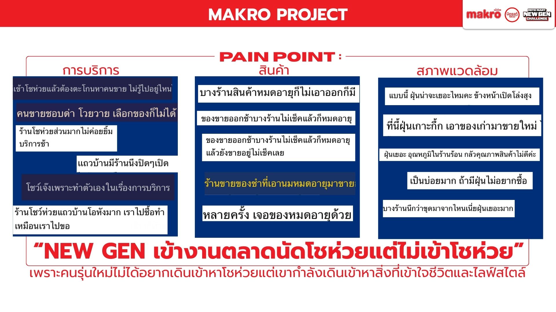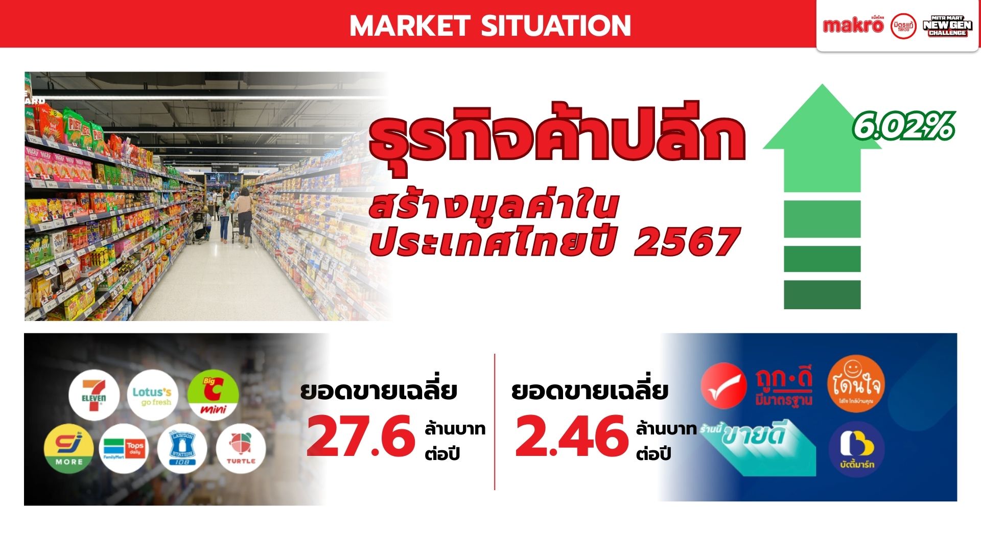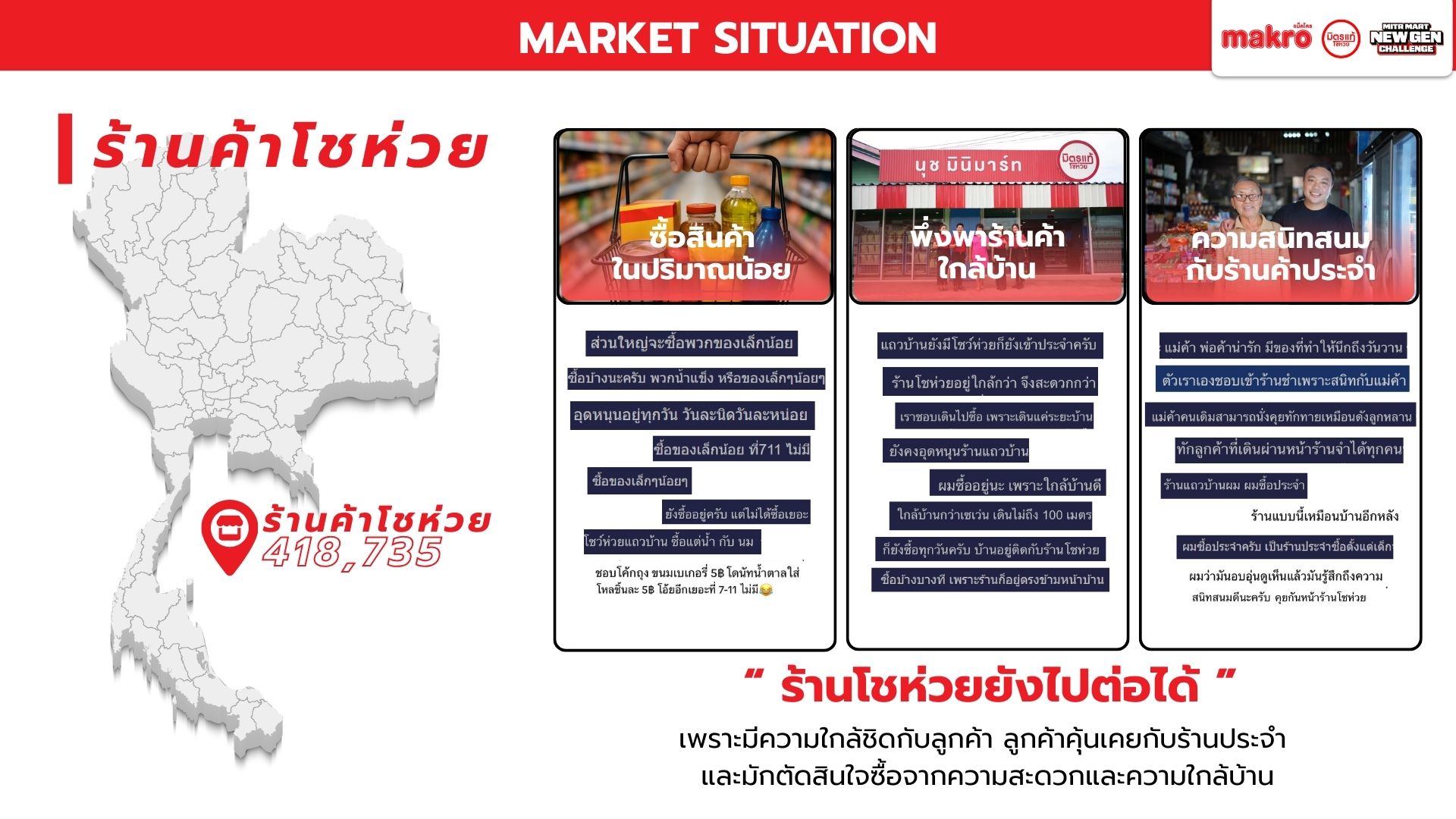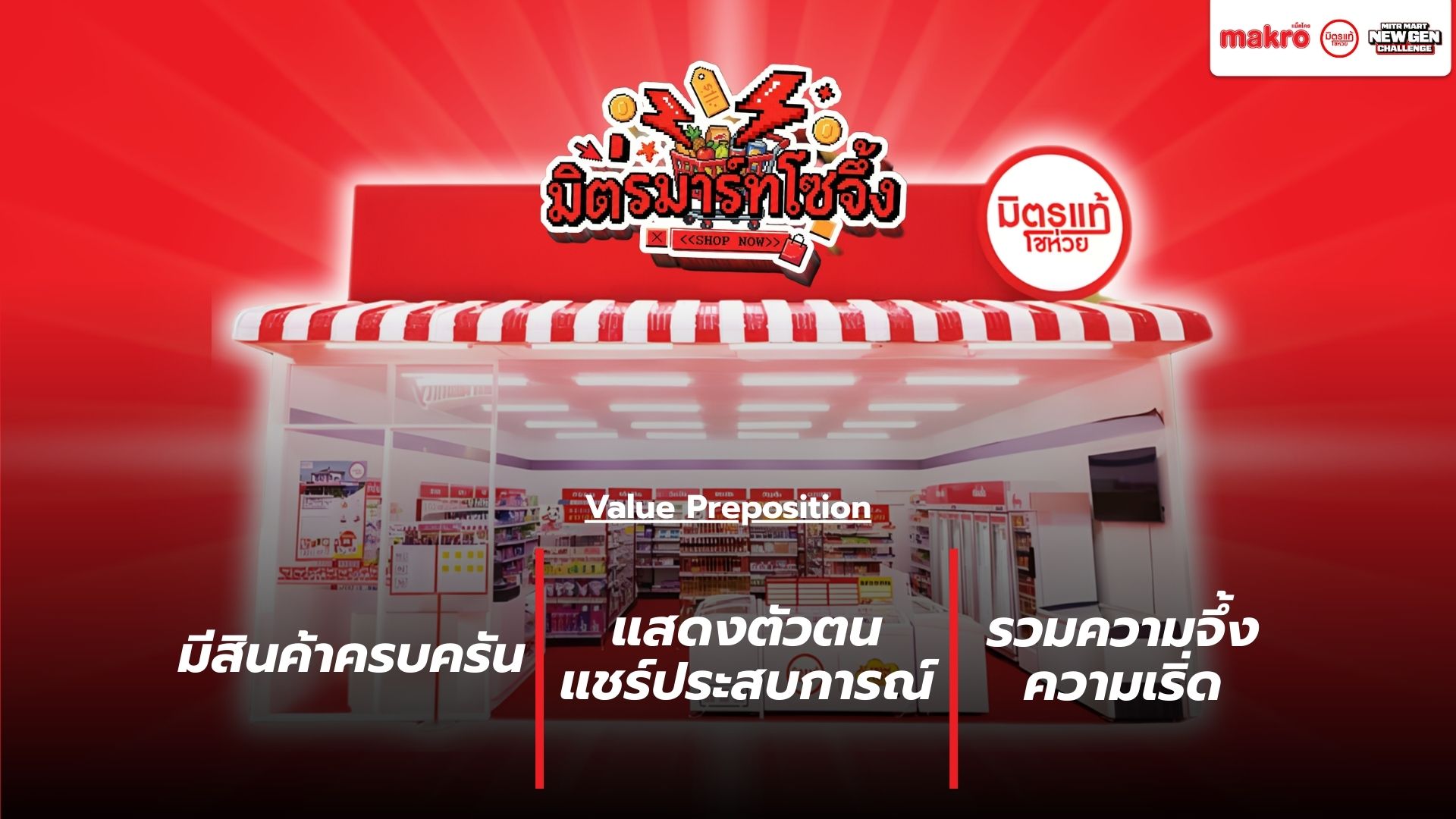 Makro วางตัวเป็นแพลตฟอร์มคู่คิดธุรกิจ เชื่อมซัพพลายเชนเพื่อช่วยผู้ประกอบการรายย่อยแข่งขันในยุค Modern Trade เนื่องจากท่ามกลางตลาดค้าปลีกไทยที่เติบโตต่อเนื่อง โชห่วยยังมีฐานลูกค้าชุมชน แต่ขาดประสิทธิภาพเมื่อเทียบกับร้านสะดวกซื้อ และมีความเสี่ยงถูกแทนที่หากไม่ปรับตัวตามพฤติกรรมผู้บริโภครุ่นใหม่ Mitr Mart New Gen จึงใช้โอกาสจากพฤติกรรมของลูกค้ายุคใหม่เพื่อออกแบบประสบการณ์ในร้านให้ตอบสนองความต้องการลูกค้าให้เกิดประสบการณ์ที่ดีลบภาพจำเก่า ๆ ของโชห่วยทั่วไป