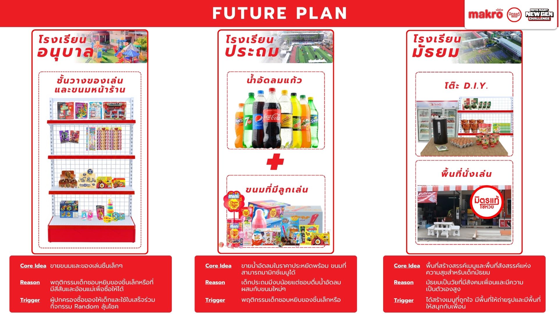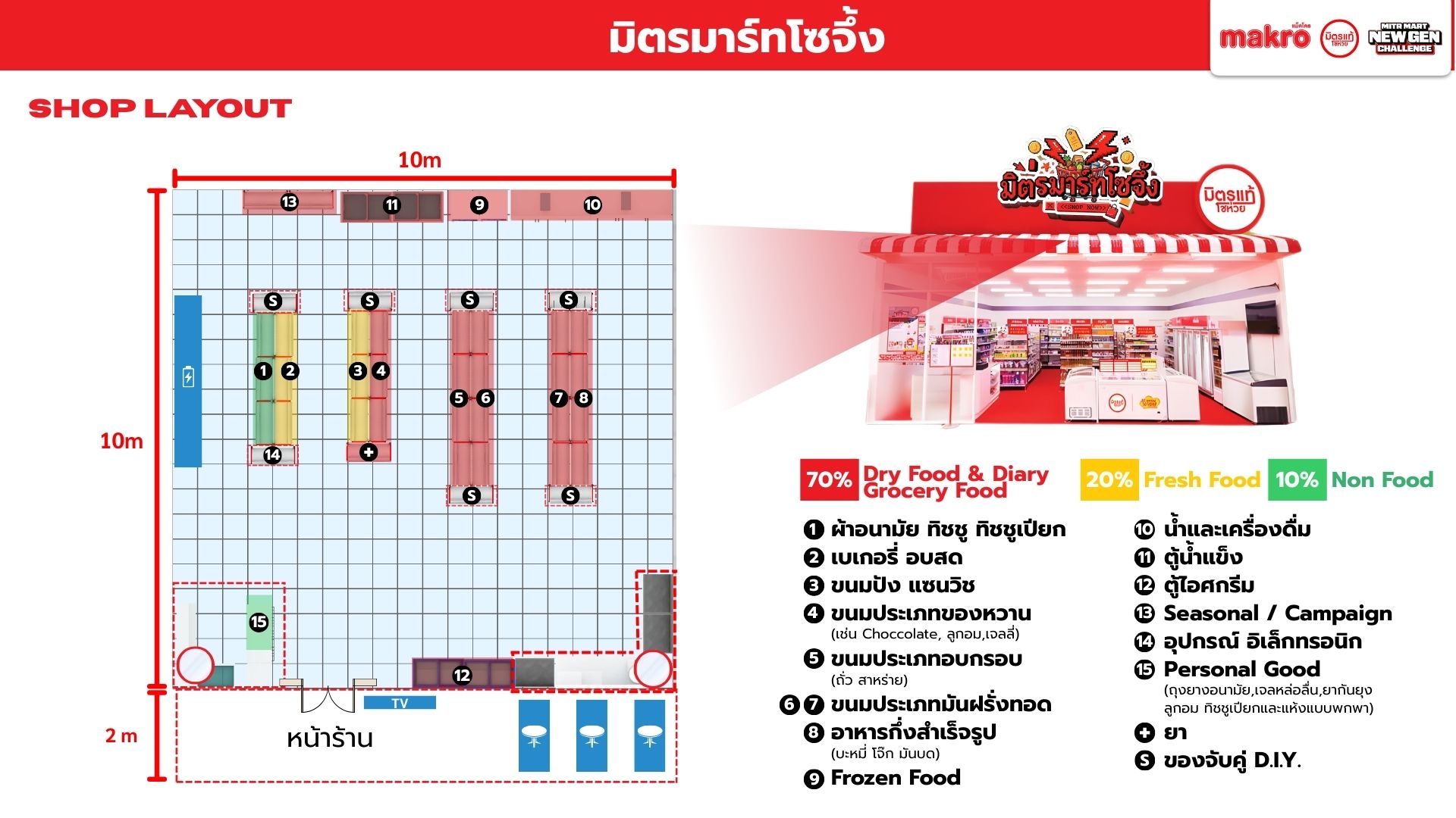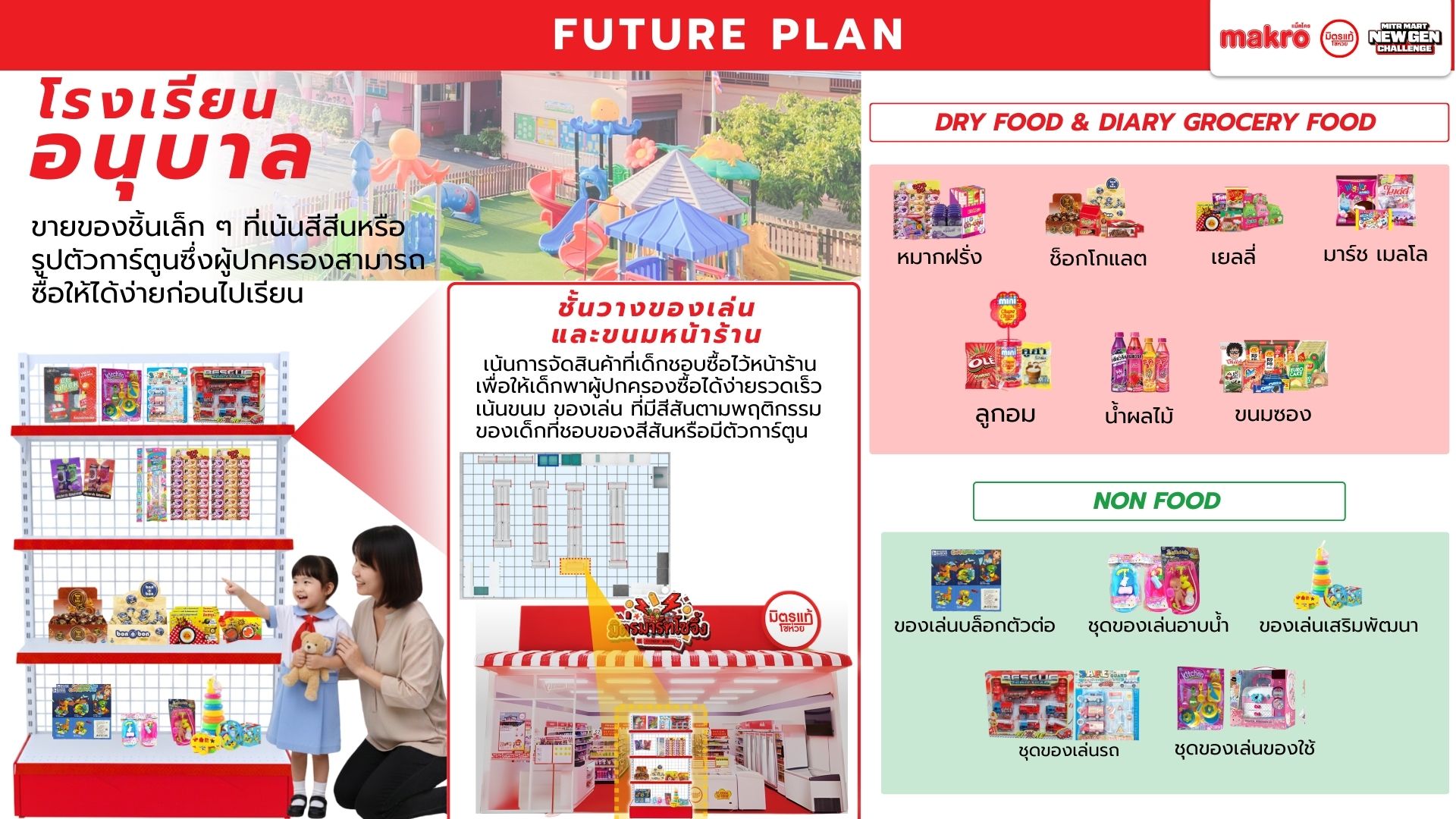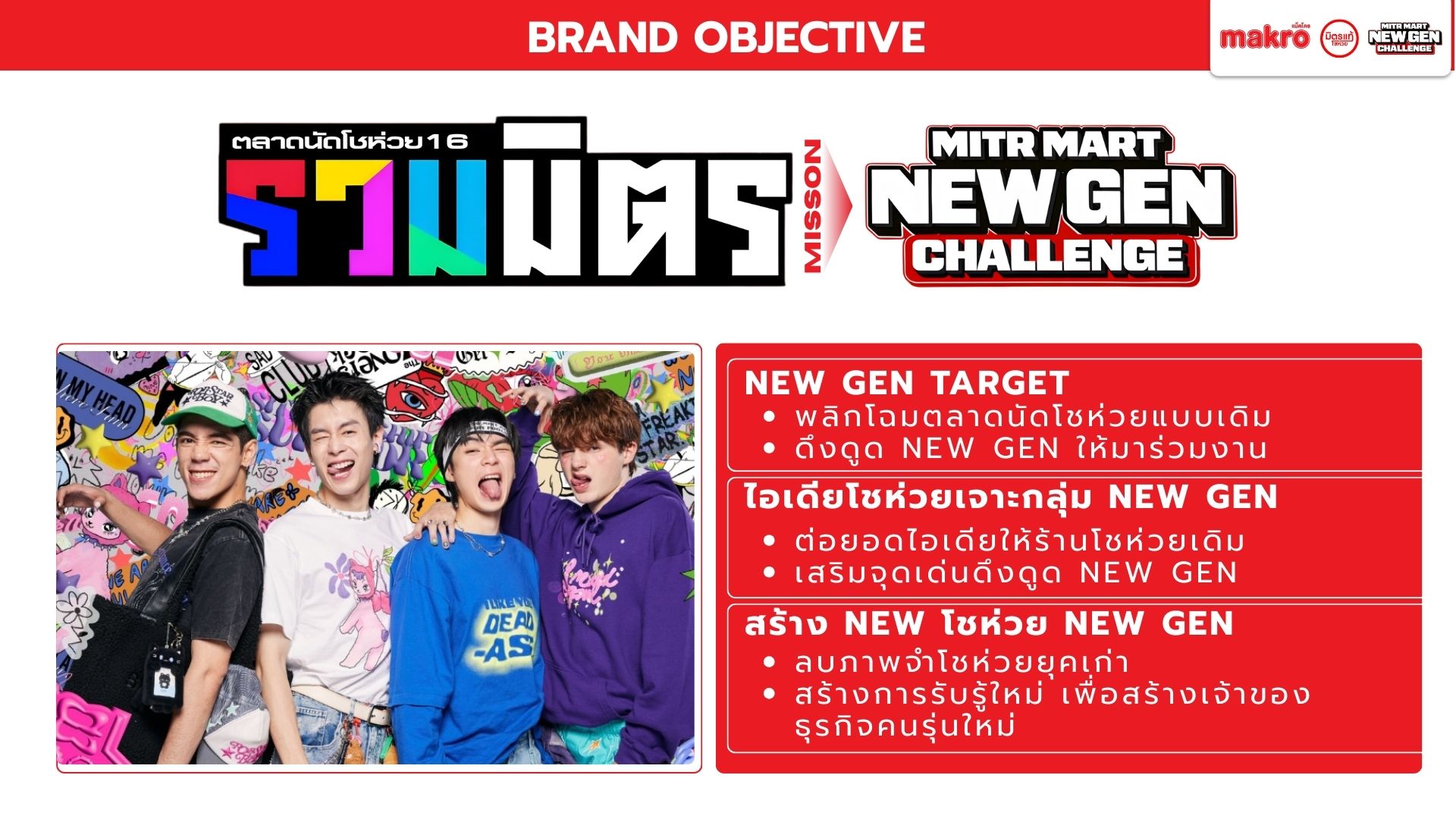 Makro วางตัวเป็นแพลตฟอร์มคู่คิดธุรกิจ เชื่อมซัพพลายเชนเพื่อช่วยผู้ประกอบการรายย่อยแข่งขันในยุค Modern Trade เนื่องจากท่ามกลางตลาดค้าปลีกไทยที่เติบโตต่อเนื่อง โชห่วยยังมีฐานลูกค้าชุมชน แต่ขาดประสิทธิภาพเมื่อเทียบกับร้านสะดวกซื้อ และมีความเสี่ยงถูกแทนที่หากไม่ปรับตัวตามพฤติกรรมผู้บริโภครุ่นใหม่ Mitr Mart New Gen จึงใช้โอกาสจากพฤติกรรมของลูกค้ายุคใหม่เพื่อออกแบบประสบการณ์ในร้านให้ตอบสนองความต้องการลูกค้าให้เกิดประสบการณ์ที่ดีลบภาพจำเก่า ๆ ของโชห่วยทั่วไป