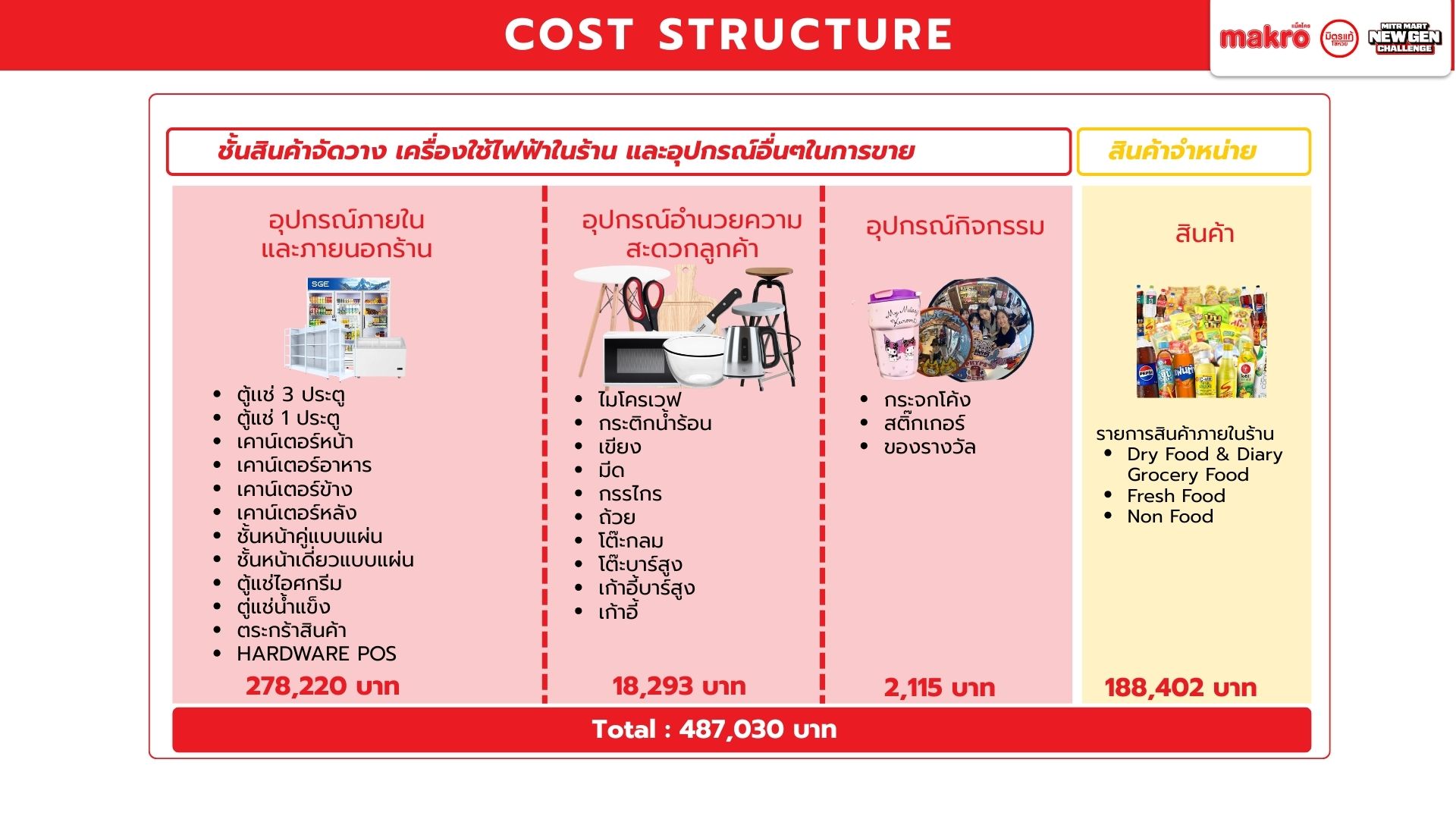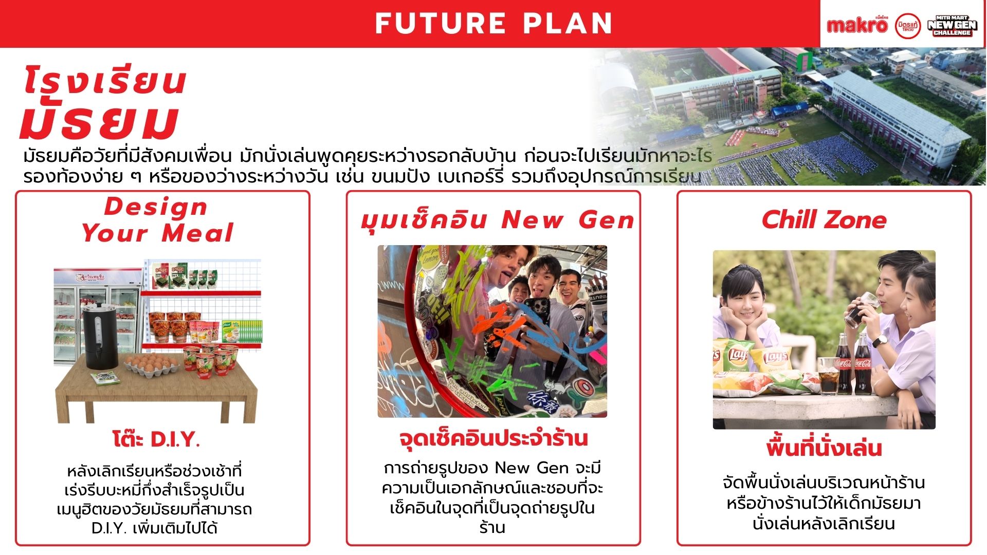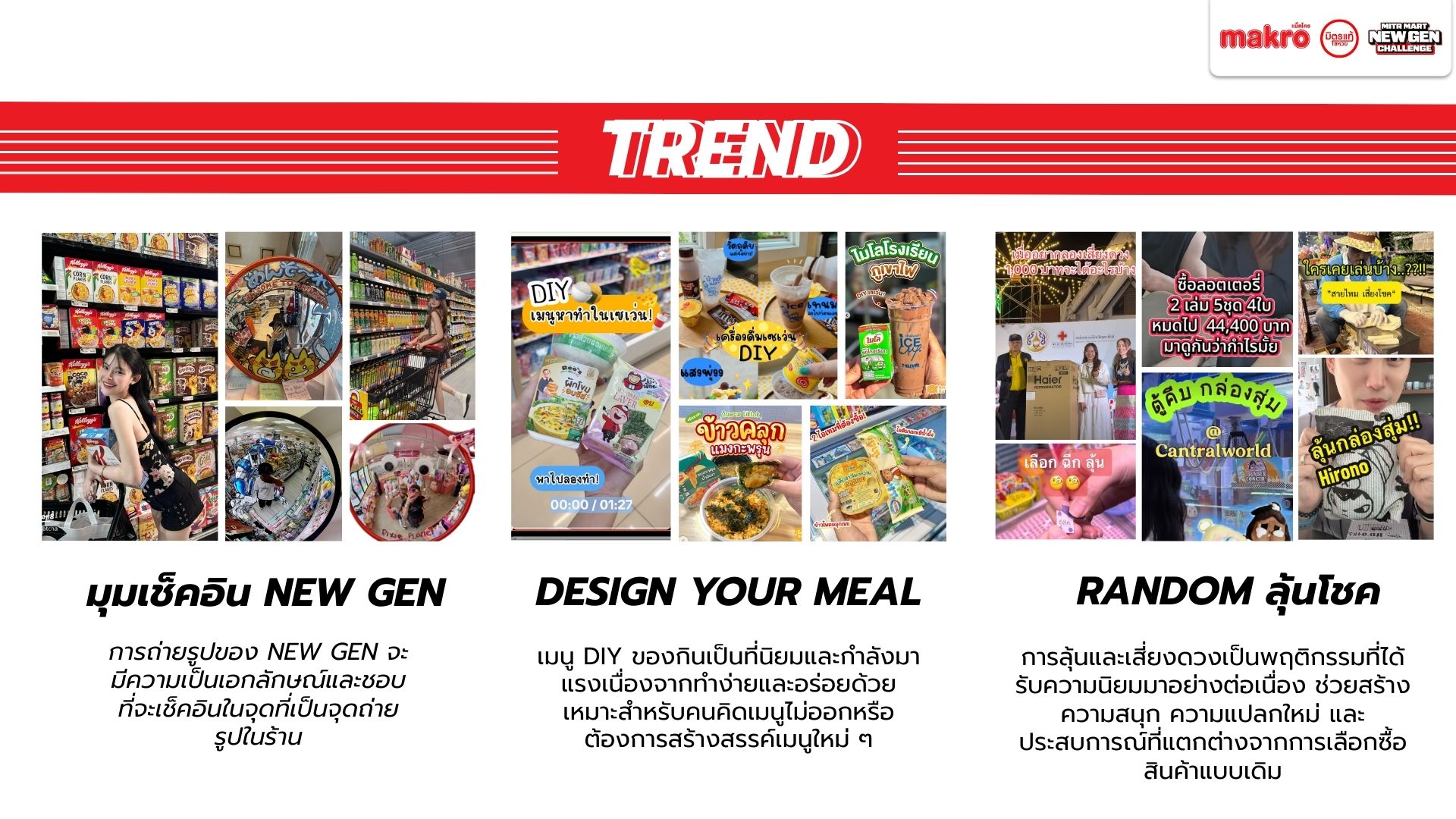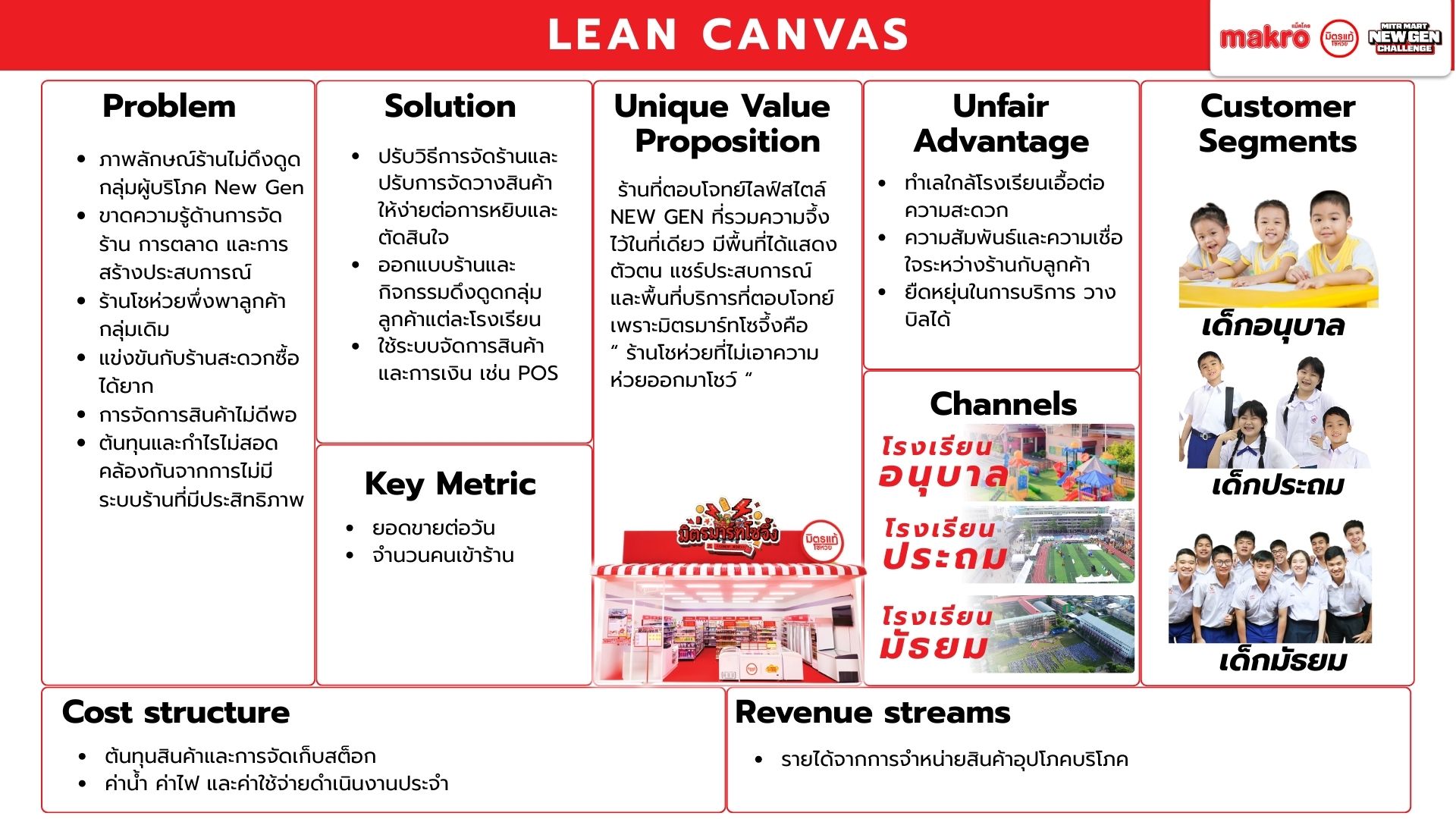 Makro วางตัวเป็นแพลตฟอร์มคู่คิดธุรกิจ เชื่อมซัพพลายเชนเพื่อช่วยผู้ประกอบการรายย่อยแข่งขันในยุค Modern Trade เนื่องจากท่ามกลางตลาดค้าปลีกไทยที่เติบโตต่อเนื่อง โชห่วยยังมีฐานลูกค้าชุมชน แต่ขาดประสิทธิภาพเมื่อเทียบกับร้านสะดวกซื้อ และมีความเสี่ยงถูกแทนที่หากไม่ปรับตัวตามพฤติกรรมผู้บริโภครุ่นใหม่ Mitr Mart New Gen จึงใช้โอกาสจากพฤติกรรมของลูกค้ายุคใหม่เพื่อออกแบบประสบการณ์ในร้านให้ตอบสนองความต้องการลูกค้าให้เกิดประสบการณ์ที่ดีลบภาพจำเก่า ๆ ของโชห่วยทั่วไป